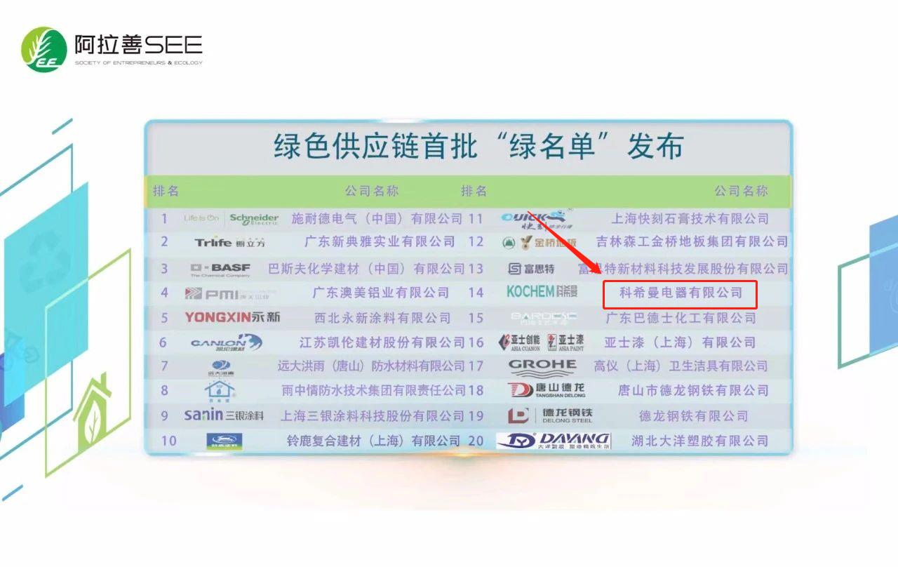 SEE第八屆中國(guó)企業(yè)綠色契約論壇上,房地產(chǎn)綠鏈行動(dòng)項(xiàng)目發(fā)布了多項(xiàng)項(xiàng)目成果,科希曼電器有限公司入選綠色供應(yīng)鏈?zhǔn)着G名單企業(yè)、“空氣源熱泵品質(zhì)與環(huán)保控制”首批白名單企業(yè)。
