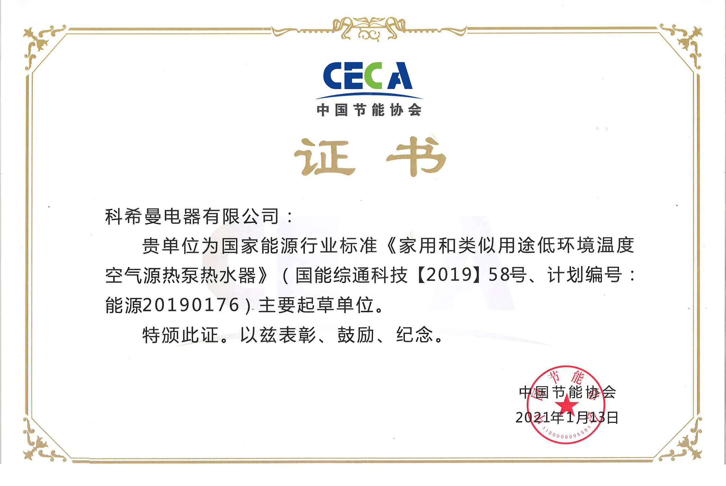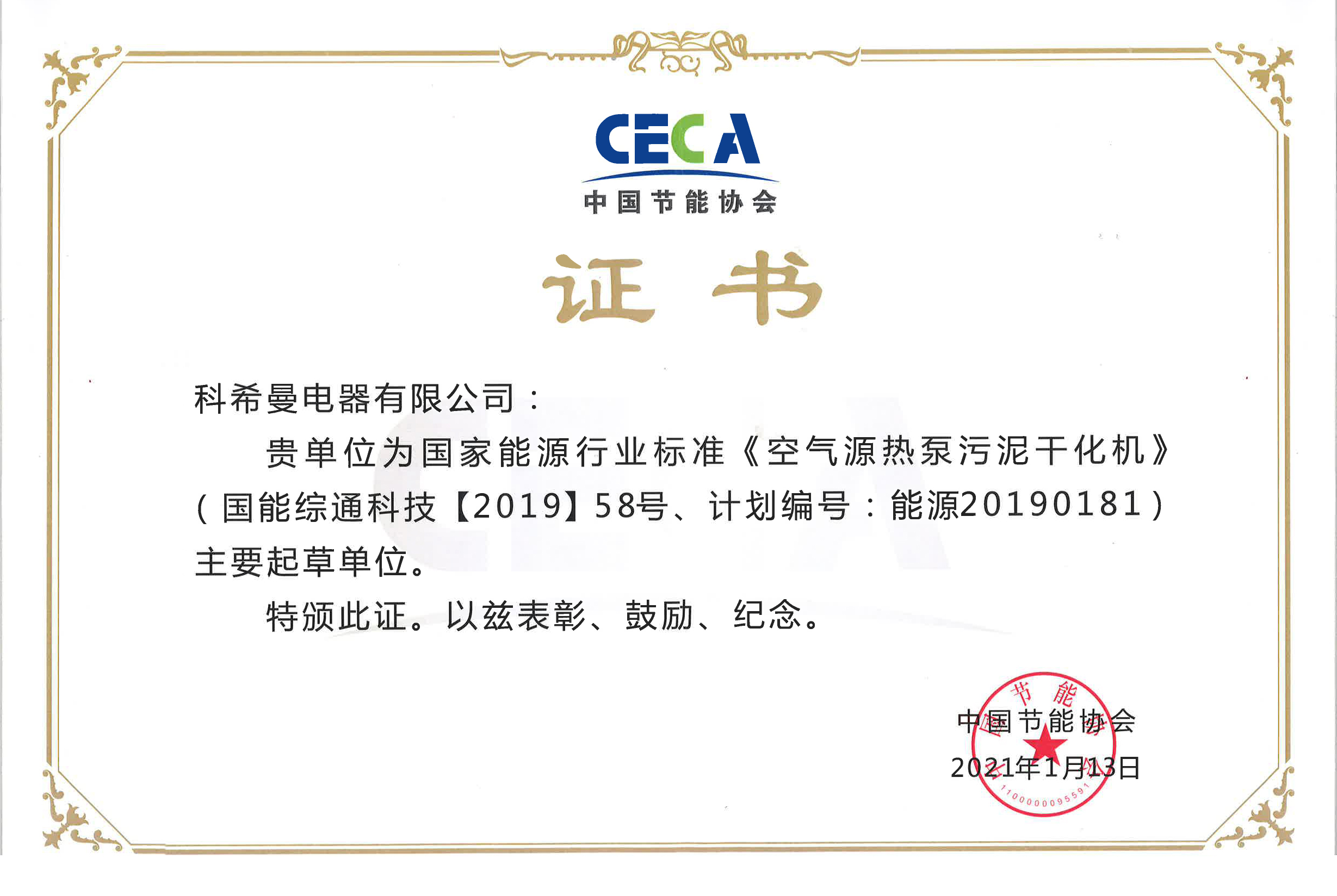 由科希曼電器有限公司主筆起草的國家能源行業(yè)標準《家用和類似用途低環(huán)境溫度空氣源熱泵熱水器》《空氣源熱泵污泥干化機》經(jīng)中國節(jié)能協(xié)會批準認證并正式頒發(fā)證書。