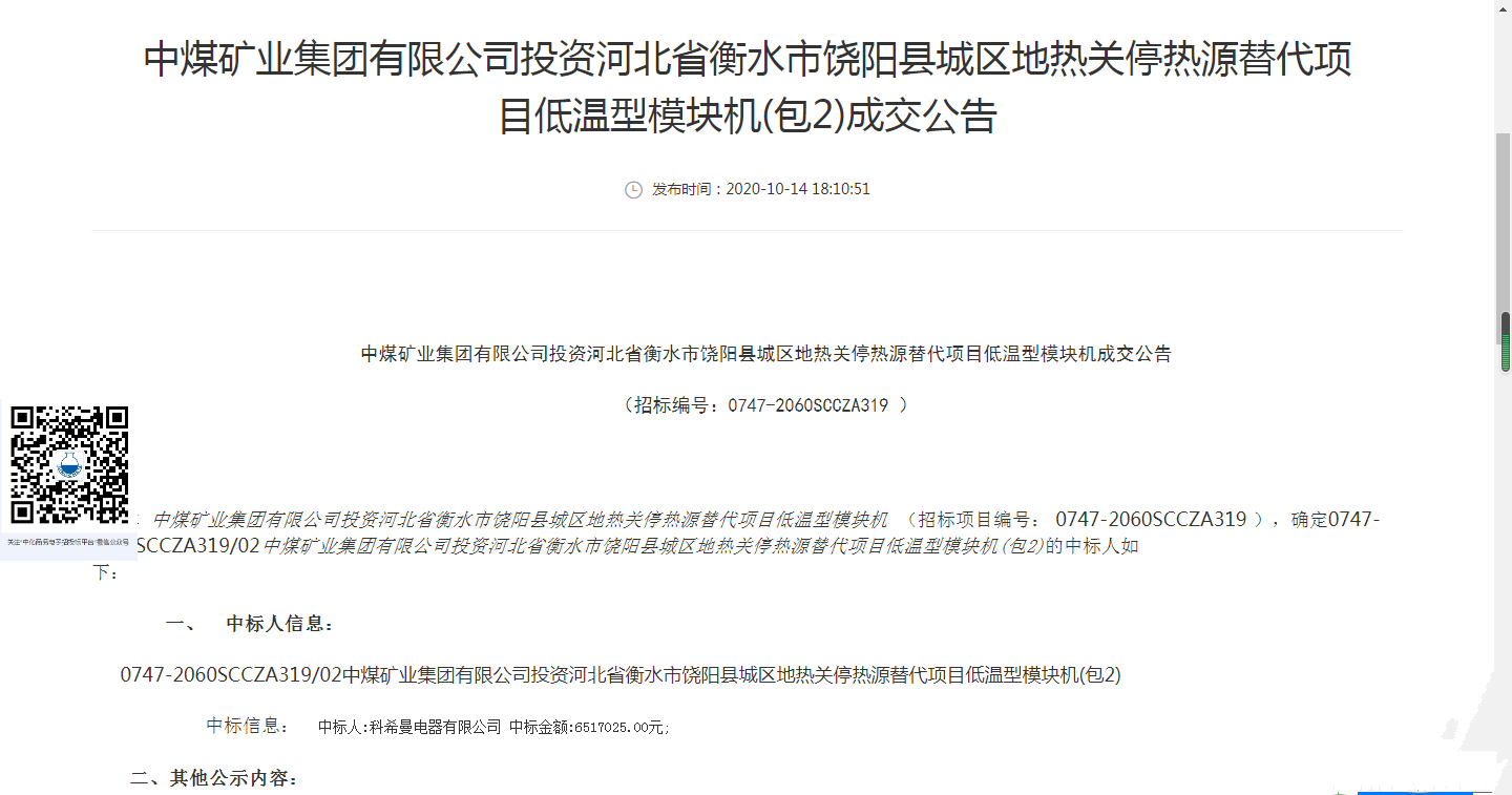 根據(jù)中化商務(wù)電子招投標(biāo)平臺(tái)10月14日發(fā)布的河北省衡水市饒陽縣城區(qū)地?zé)彡P(guān)停熱源替代項(xiàng)目低溫型模塊機(jī)(包2)成交公告顯示,科希曼電器有限公司實(shí)力中標(biāo)。