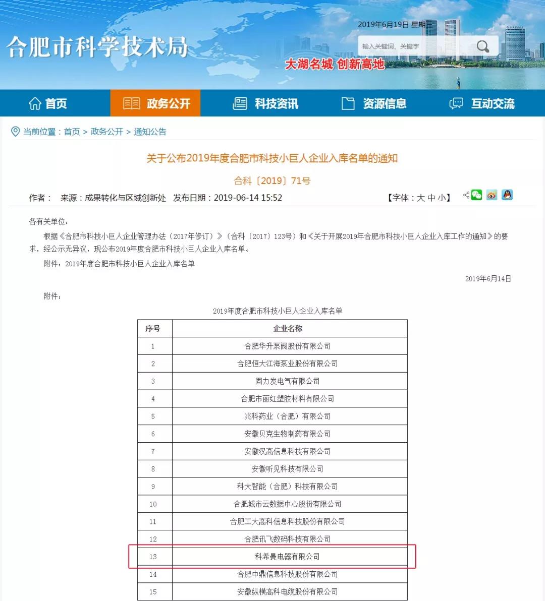 經(jīng)合肥市科學技術局專家專業(yè)評審及實地調(diào)研考察,科希曼電器有限公司憑借行業(yè)先進的技術、自主創(chuàng)新能力和良好的發(fā)展勢頭,入選2019年度合肥市科技小巨人企業(yè)名單。
