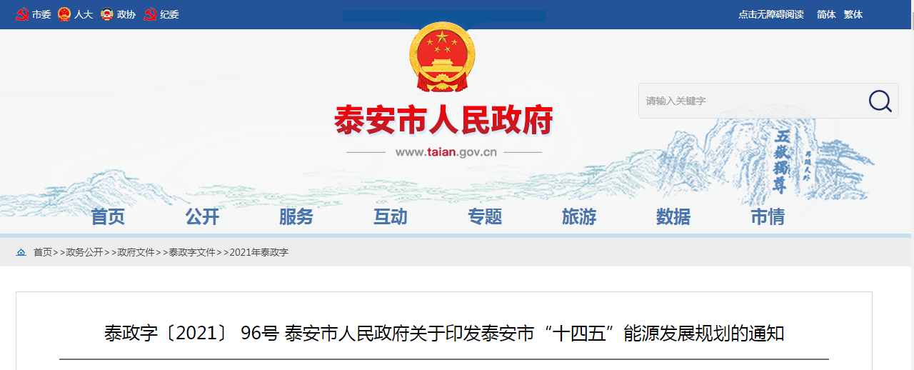 日前,泰安市人民政府下發(fā)《泰政字〔2021〕96號(hào)泰安市人民政府關(guān)于印發(fā)泰安市“十四五”能源發(fā)展規(guī)劃的通知》(以下簡(jiǎn)稱(chēng)“規(guī)劃”),根據(jù)規(guī)劃內(nèi)容顯示,“十四五”期間,泰安市能源消費(fèi)總量保持基本穩(wěn)定,煤炭消費(fèi)量下降10%,年生產(chǎn)能力達(dá)1000萬(wàn)噸;電力裝機(jī)總量達(dá)1000萬(wàn)千瓦以上,全社會(huì)用電量達(dá)到270億千瓦時(shí),全市新能源產(chǎn)業(yè)年?duì)I業(yè)收入達(dá)到170億元,年均增長(zhǎng)15%以上。能源結(jié)構(gòu)方面,天然氣占比提高至9.36%,非化石能源占比提高至15%以上;煤電發(fā)電量、可再生能源發(fā)電量、市外電量占全社會(huì)用電量的比重由57:18:25優(yōu)化到48:26:26,可再生能源發(fā)電量占總發(fā)電量的比重提高到36%以上。能源民生改善目標(biāo)。人均生活用能達(dá)到500千克標(biāo)準(zhǔn)煤左右。完善天然氣基礎(chǔ)設(shè)施建設(shè),實(shí)施管道燃?xì)獯宕逋üこ?,全市縣城及以上城區(qū)實(shí)現(xiàn)清潔取暖全覆蓋,農(nóng)村地區(qū)基本實(shí)現(xiàn)清潔取暖。