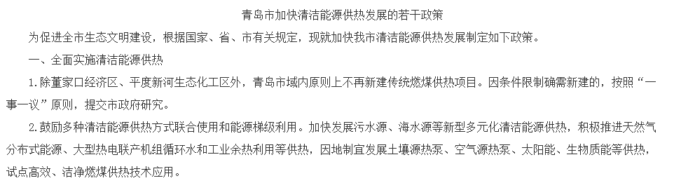 青島市域內(nèi)不再新建傳統(tǒng)燃煤供熱項(xiàng)目,鼓勵(lì)多種清潔能源供熱方式聯(lián)合使用和能源梯級(jí)利用,對(duì)利用清潔能源供熱的新建項(xiàng)目加大財(cái)稅支持力度。在青島市施行的《加快清潔能源供熱發(fā)展的若干政策》中還指出,按照現(xiàn)有燃煤供熱企業(yè)政策性運(yùn)行補(bǔ)貼標(biāo)準(zhǔn),對(duì)新建海水源熱泵、污水源熱泵、土壤源熱泵、空氣源熱泵和生物質(zhì)集中供熱項(xiàng)目居住建筑部分給予補(bǔ)貼。