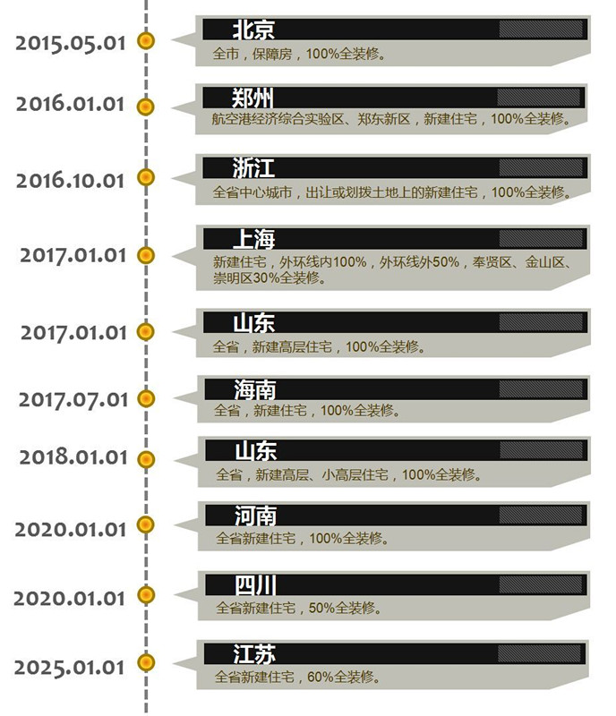 在過去幾年,房地產(chǎn)政策不斷加碼,浙江、上海、山東等地城市相繼出臺“100%精裝修”政策,即2020年全面實現(xiàn)100%精裝配套的目標(biāo)。江蘇、北京、河南、四川、海南等地陸續(xù)制定出“毛坯房”退出倒計時。